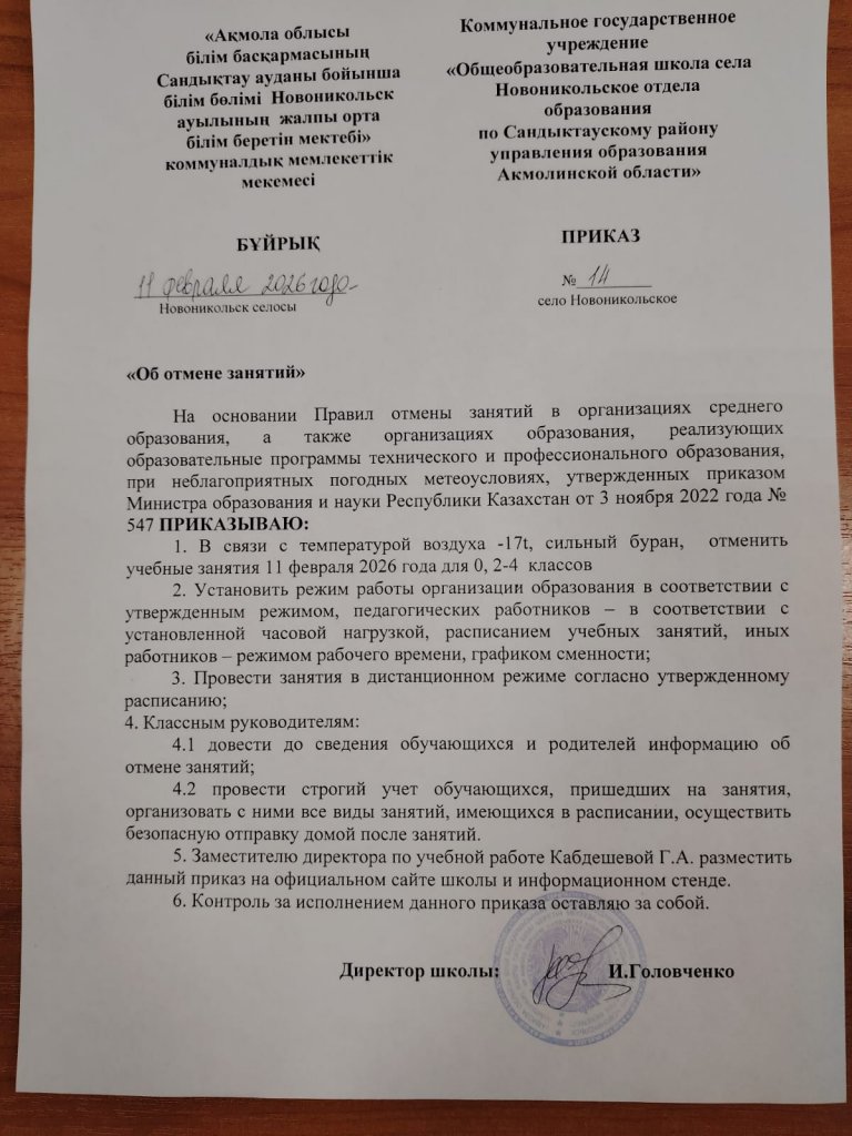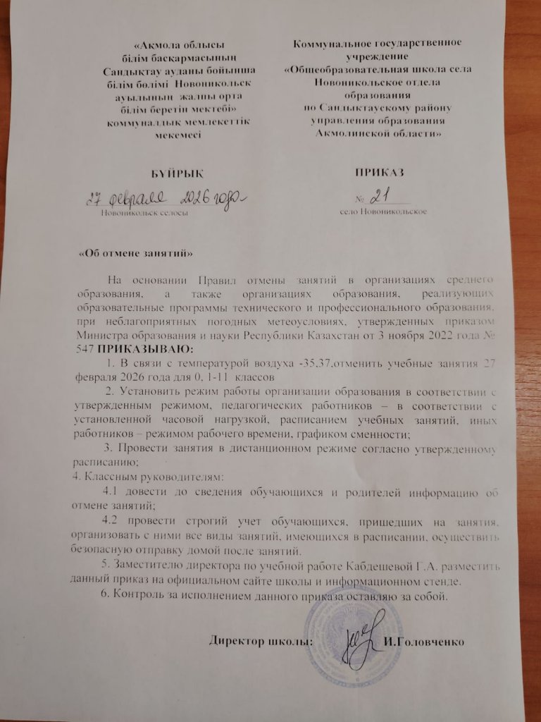 «Бұйрық № 21 2026 жылғы 27 ақпан 0 және 1–11 сыныптарда оқу сабақтарын тоқтату туралы»