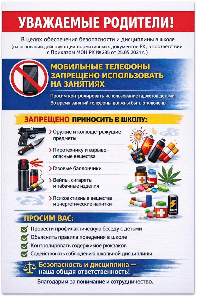 Мектепте қауіпсіздікті қамтамасыз ету және тәртіпті сақтау мақсатында, ҚР БҒМ-нің 2021 жылғы 25 мамырдағы №235 бұйрығына сәйкес, сабақ барысында ұялы телефондарды пайдалануға тыйым салынады.