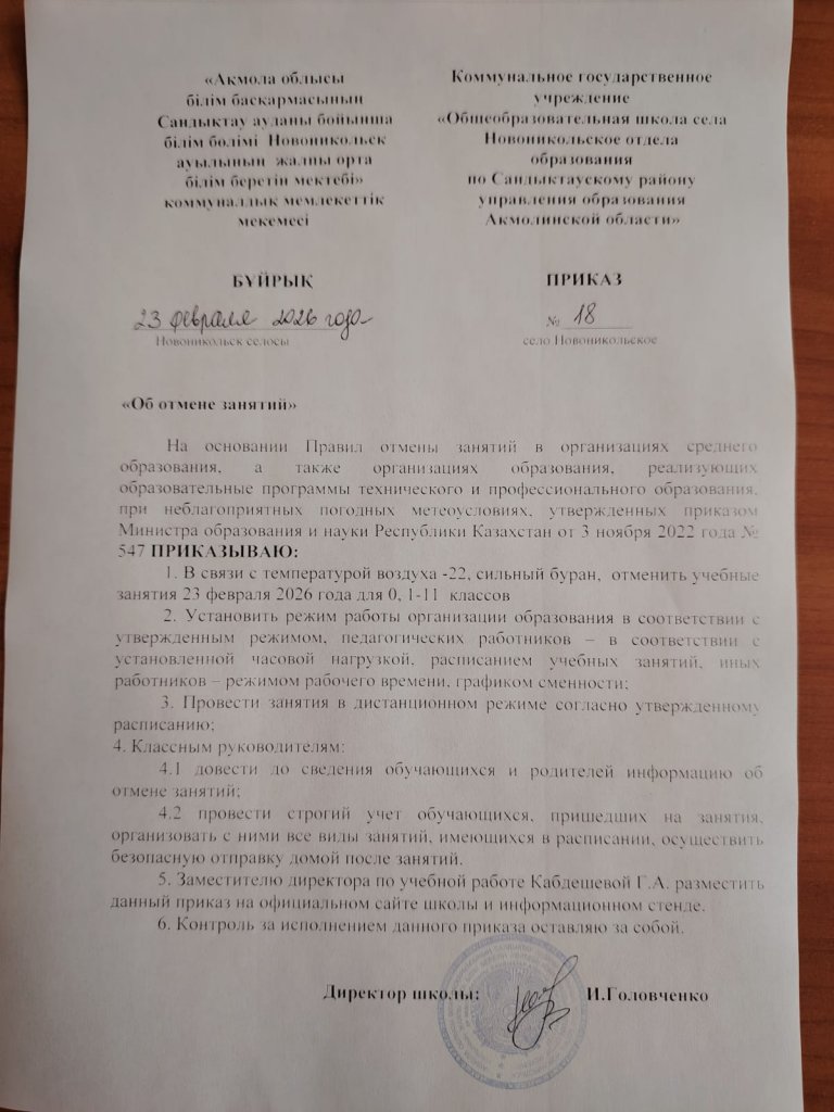2026 жылғы 23 ақпандағы №18 бұйрық 0,1–11 сыныптар үшін оқу сабақтарын тоқтату туралы