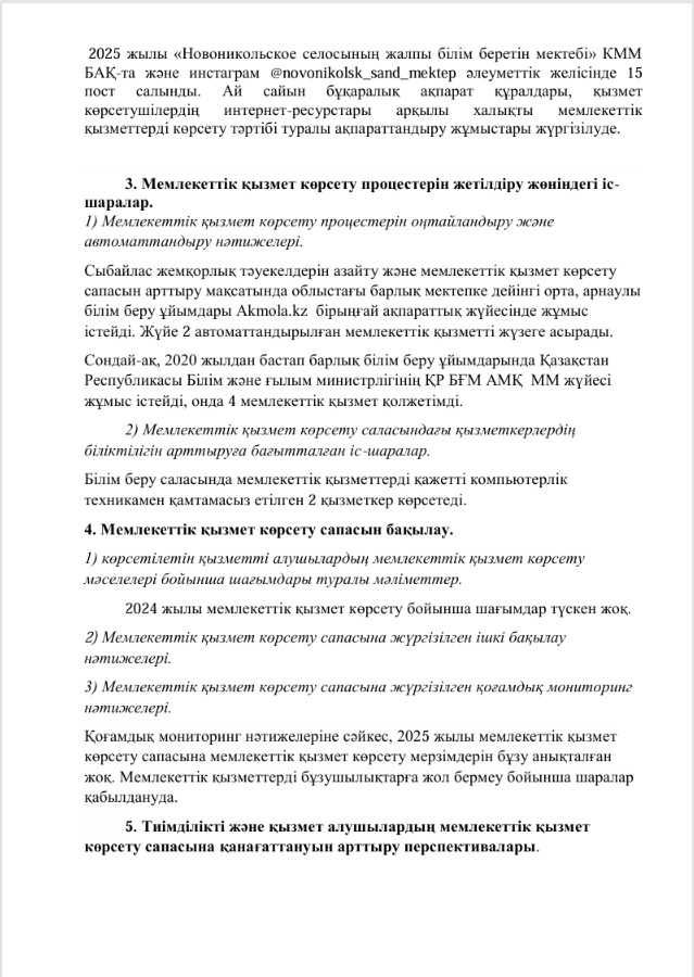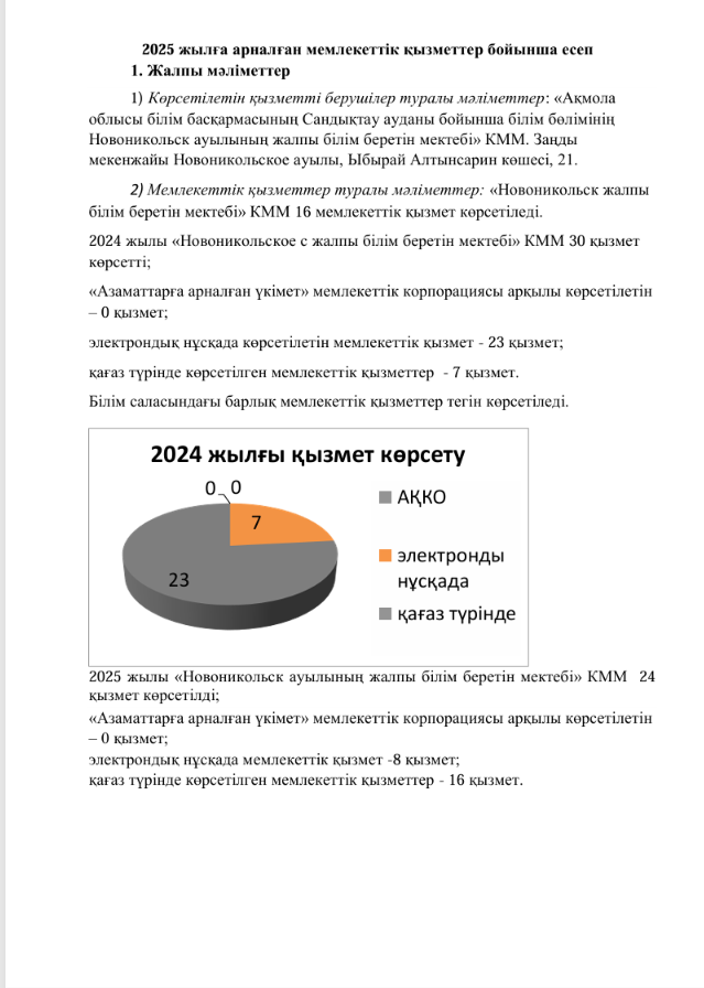 Көрсету бойынша есепті жария талқылау "Ақмола облысы білім басқармасының Сандықтау ауданы бойынша білім бөлімінің Новоникольское селосының жалпы білім беретін мектебі" КММ мемлекеттік көрсетілетін қызметтер