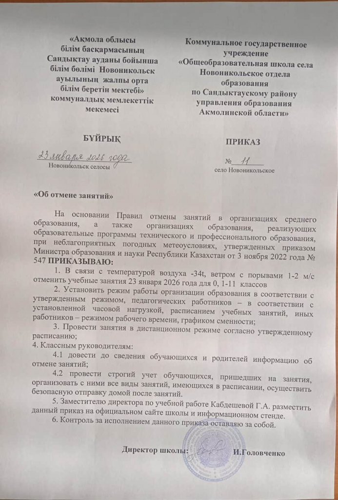 Приказ № 11 от 23 января 2026 года об отмене учебных занятий для 0, 1-11 классов