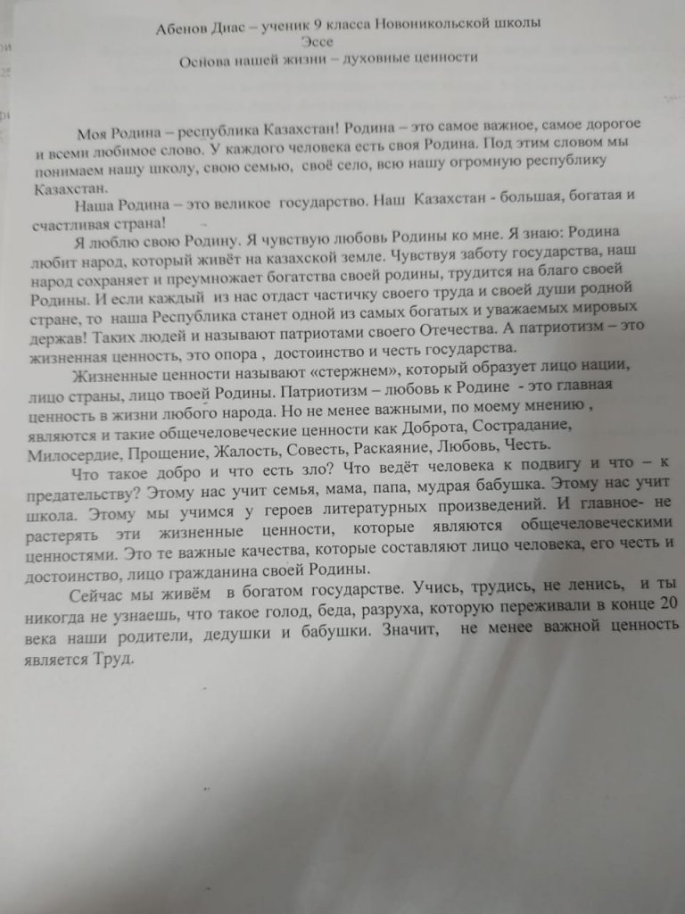 Адами құндылықтар күні аясында Новоникольск мектебінде өз композициясы бойынша эссе мен өлеңдер байқауы өтті. Оқушылар өз шығармаларында аналарына, Отанына деген сүйіспеншіліктерін білдірді, жақсылық пен жамандық туралы, патриотизм, еңбек, ар-намыс пен жанашырлық...